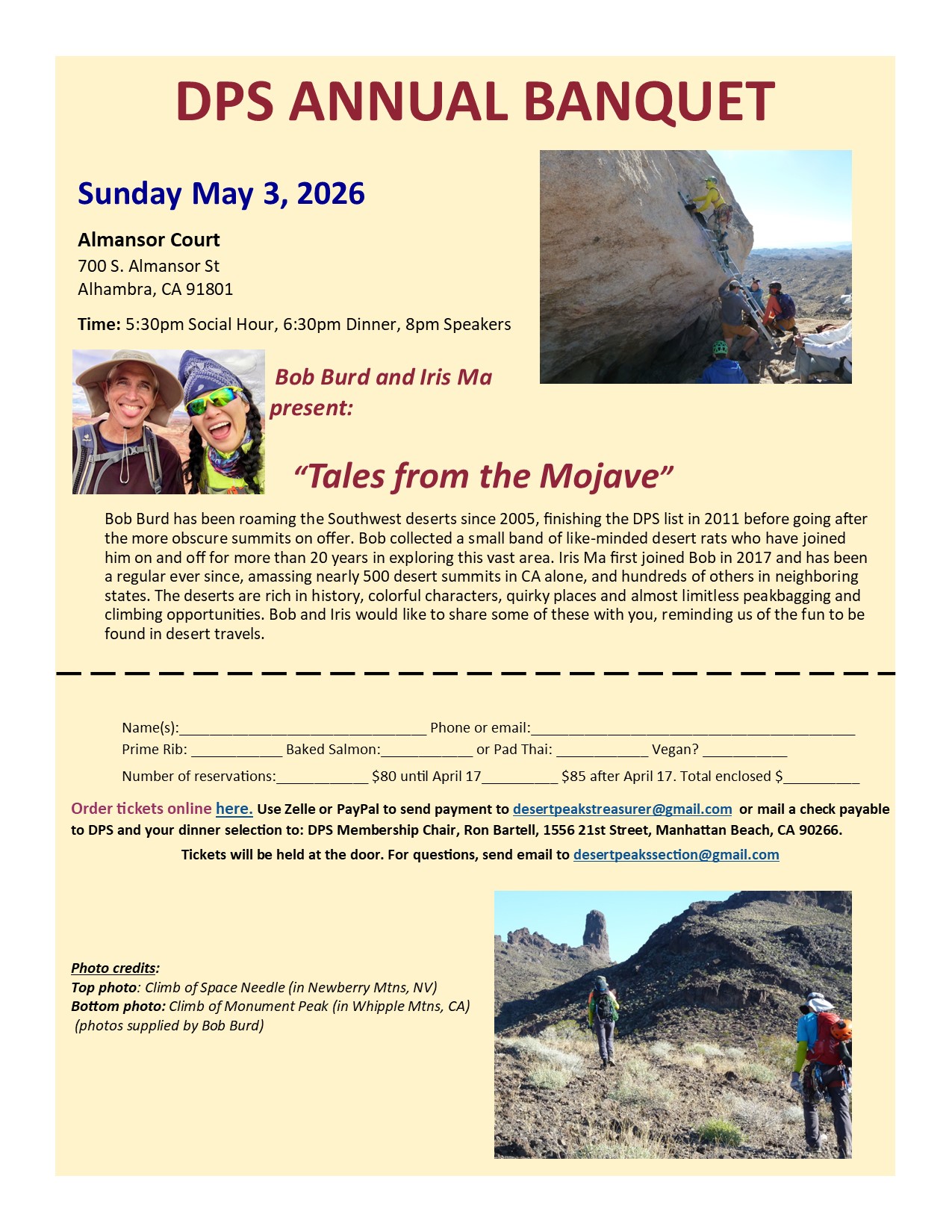Sunday May 3, 20265:30pm – 9.30pmAlmansor CourtAlhambra, CA 91801 Bob Burd and Iris Ma present:“Tales from the Mojave” Tickets: $80 until April 17, $85 after April 17 Click here for Banquet flyer